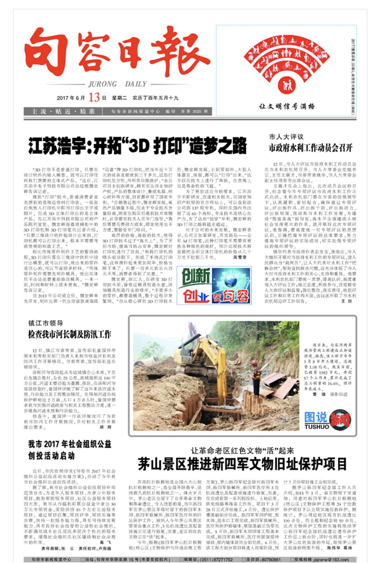日报头版头条《江苏浩宇:开拓“3D打印”造梦之路》