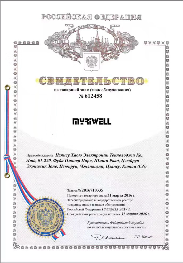 热烈祝贺江苏浩宇电子科技有限公司迈睿"MYRIWELL"商标在俄罗斯注册成功!